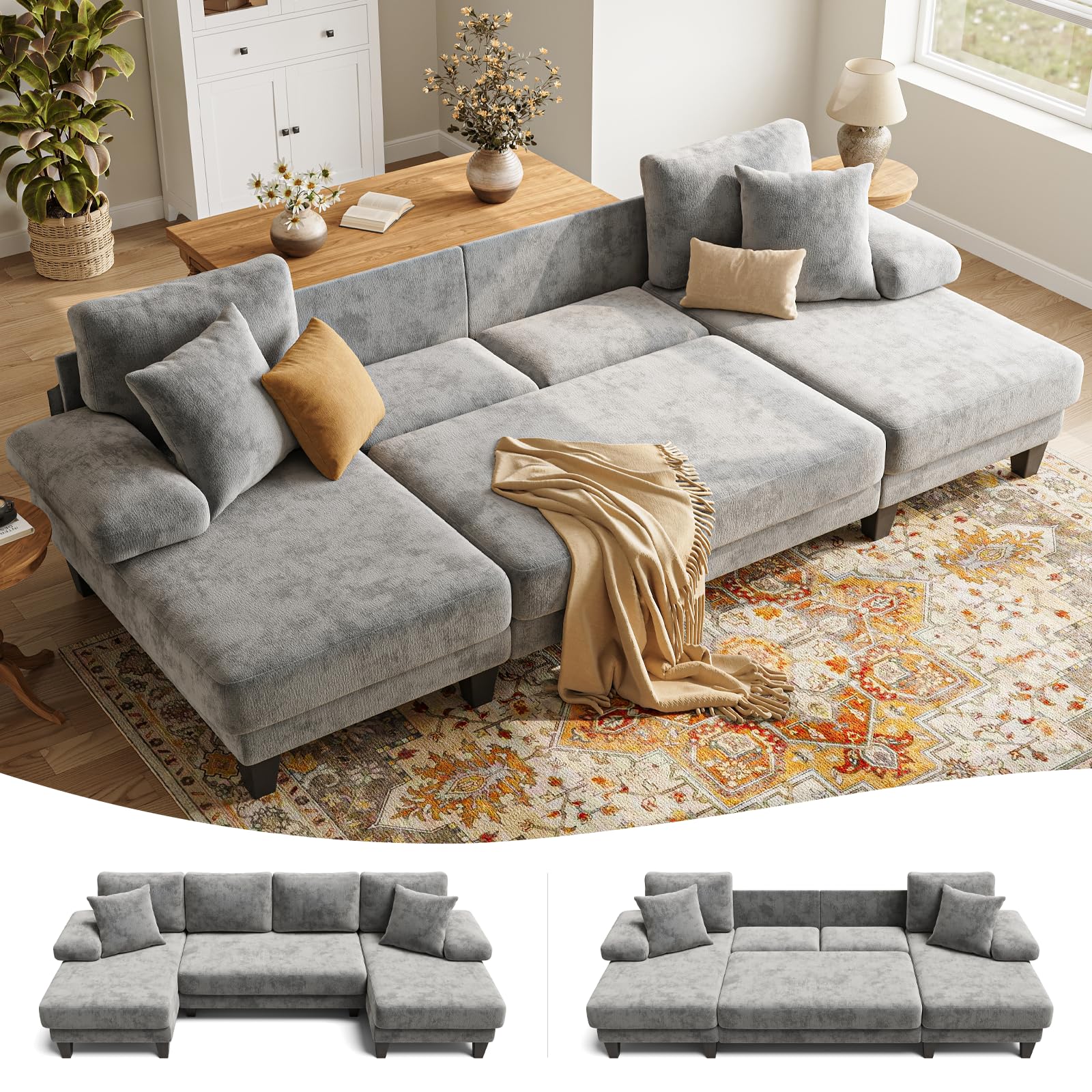 Txtin's Sleeper Sofa with Pull Out Couch Bed | 112 Inch Couches for Living Room | U-Shaped Convertible Sofa Bed | Chenille Light Grey