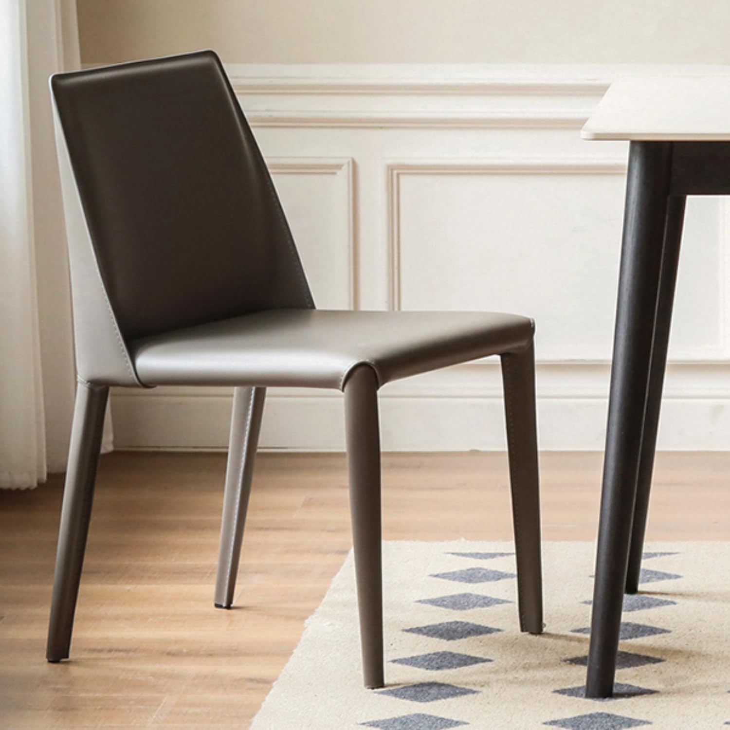 Elevate your dining space with this modern grey leather upholstered chair. Minimalist saddle leat...read more